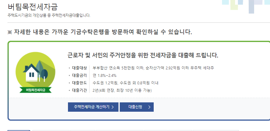 주택도시기금 버팀목전세대출은 서민들의 주거안정을 위한 서민대출 중 하나인데요 부부합산 연소득 5000만원 이하의 서민들을 대상으로 한 대출 상품이라고 할 수 있어요 사실 연소득 5천만원 기준이 부부합산이기 때문에 이런 제한적인 조건은 아쉽기는 합니다. 적은 금액은 아니지만 부부합산소득이 이보다 조금 더 넘어도 실상 생활수준은 크게 차이가 나지 않으니까요 좀 더 완화된 조건으로 제공되면 좋겠다는 생각도 들긴합니다.