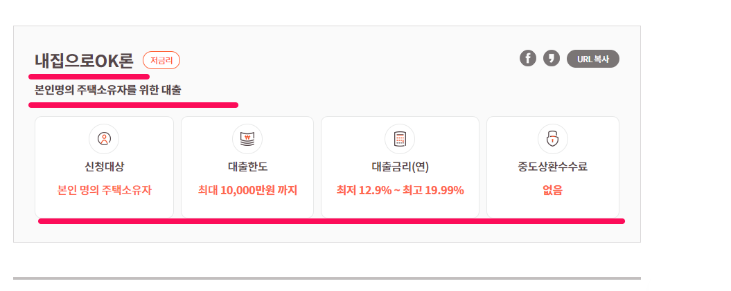 2금융권인 만큼 담보 상태가 좋지 못하거나 신용도가 낮아 1금융권에서 받지 못하였던 분들도 이용할 수 있는 상품으로 최대한도 1억원 까지 가능한 상품입니다.
